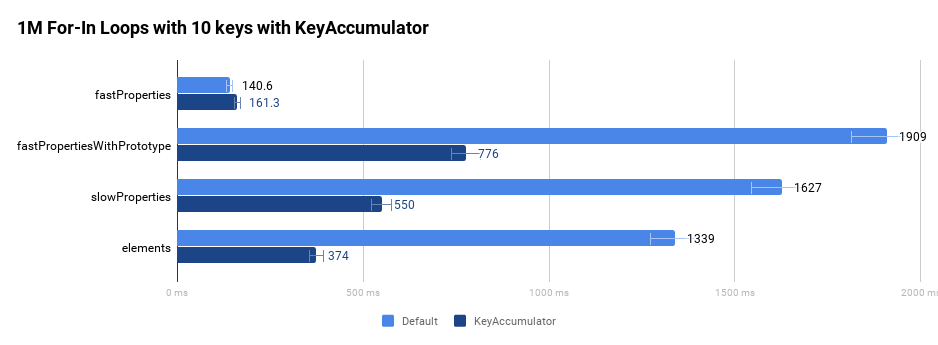 We introduced a separate helper class, the KeyAccumulator, which dealt with the complexities of collecting the keys for for-in. With growth of the ES6 spec, new features like Object.keys or Reflect.ownKeys required their own slightly modified version of collecting keys. By having a single configurable place we could improve the performance of for-in and avoid duplicated code.