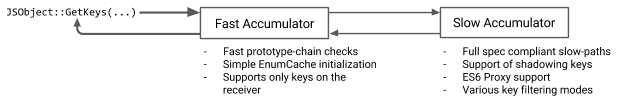 The KeyAccumulator consists of a fast part that only supports a limited set of actions but is able to complete them very efficiently. The slow accumulator supports all the complex cases, like ES6 Proxies.