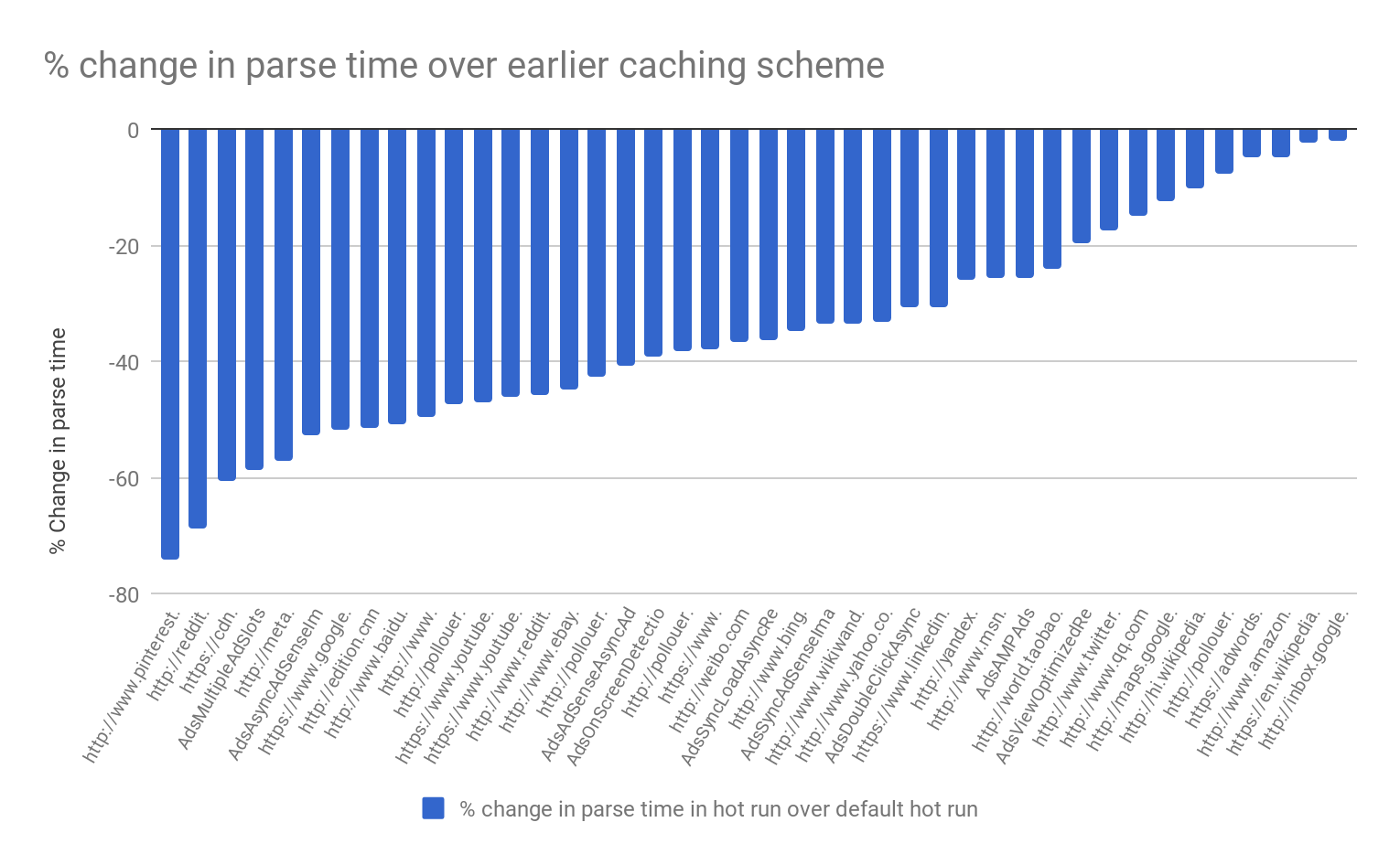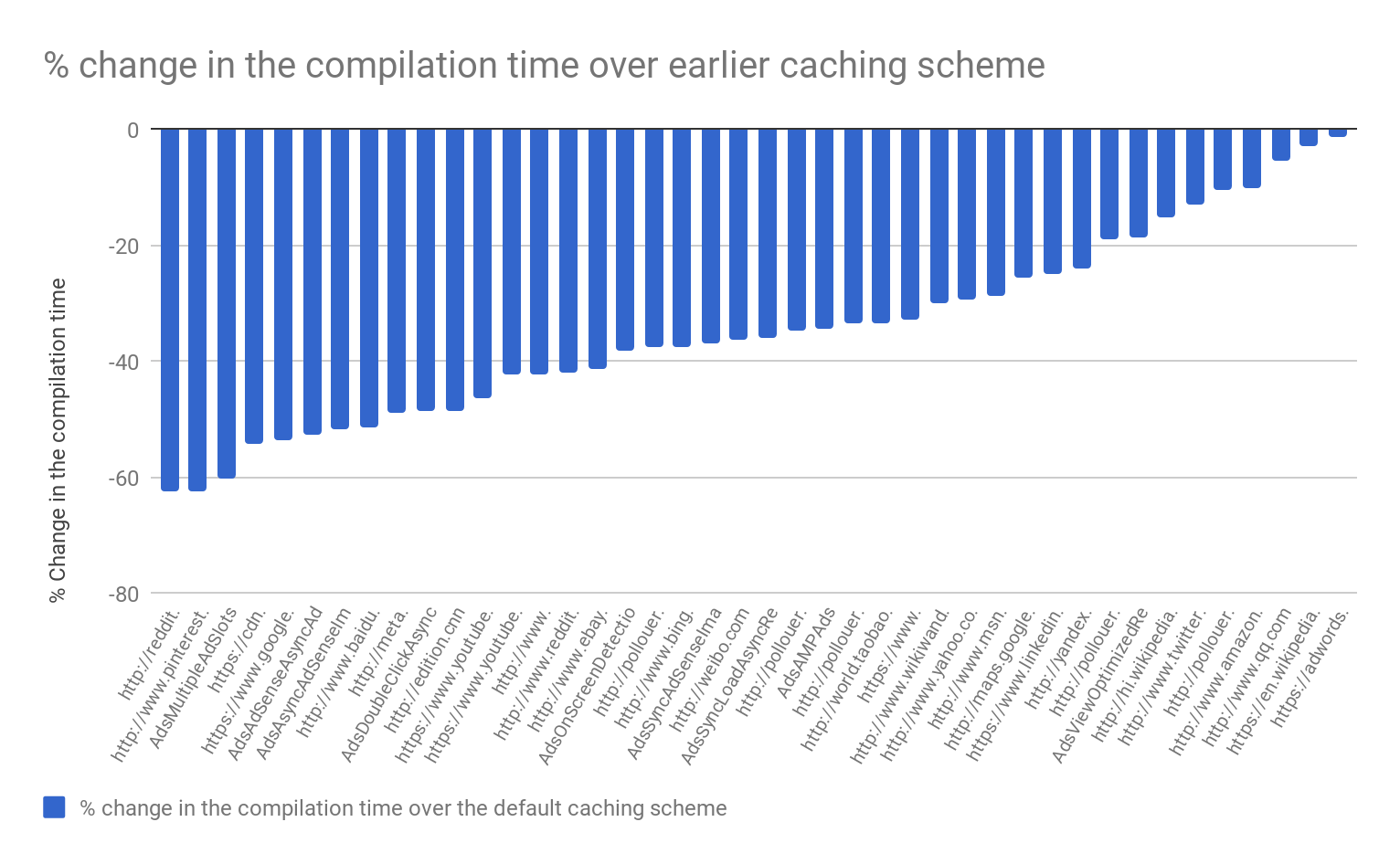 The performance of this feature is measured using our internal real-world benchmarks. The following graph shows the reduction in the parse and compile time over the earlier caching scheme. There is a reduction of around 20–40% in both parse and compilation time on most of the pages.