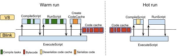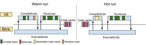 Embedders could request that V8 serialize the code it generated during its top-level compilation of a new JavaScript source file. V8 returned the serialized code after compiling the script. When Chrome requests the same script again, V8 fetches the serialized code from the cache and deserializes it. V8 completely avoids recompiling functions that are already in the cache. These scenarios are shown in the following figure: