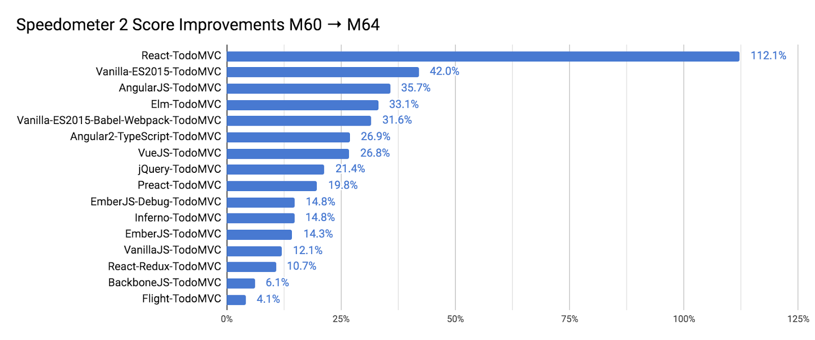 Score improvements for each Speedometer 2 subtest from Chrome 60 to 64