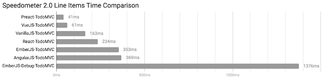 A significant change over Speedometer 1.0 is the calculation of the final score. Previously the average of all scores favoured working only on the slowest line items. When looking at the absolute times spent in each line item we see for instance that the EmberJS-Debug version takes roughly 35 times as long as the fastest benchmark. Hence to improve the overall score focusing on EmberJS-Debug has the highest potential.