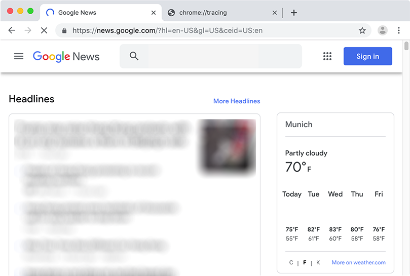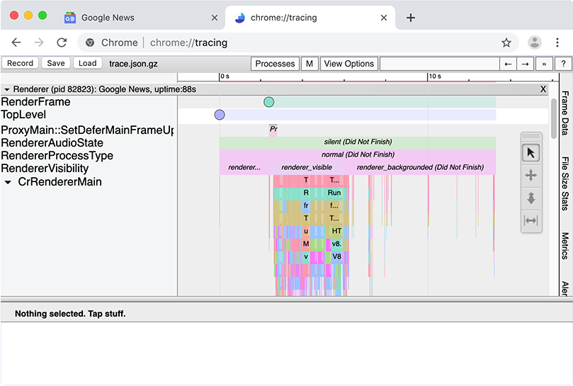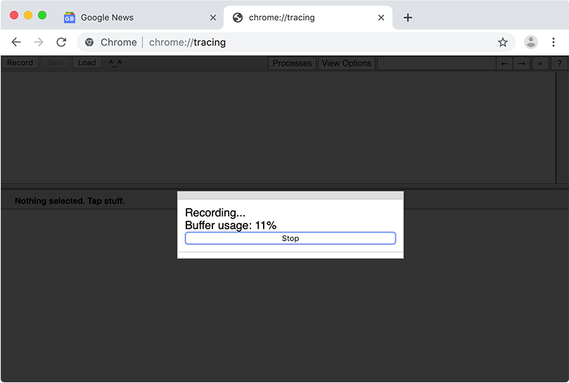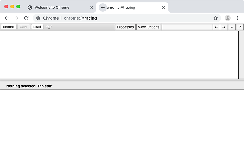 Add a second tab and open chrome://tracing. Tip: you can just enter chrome:tracing, without the slashes.