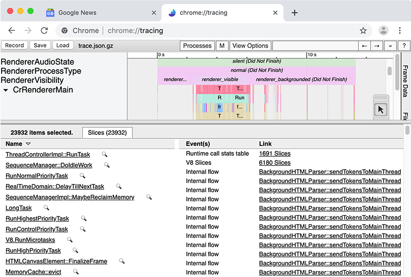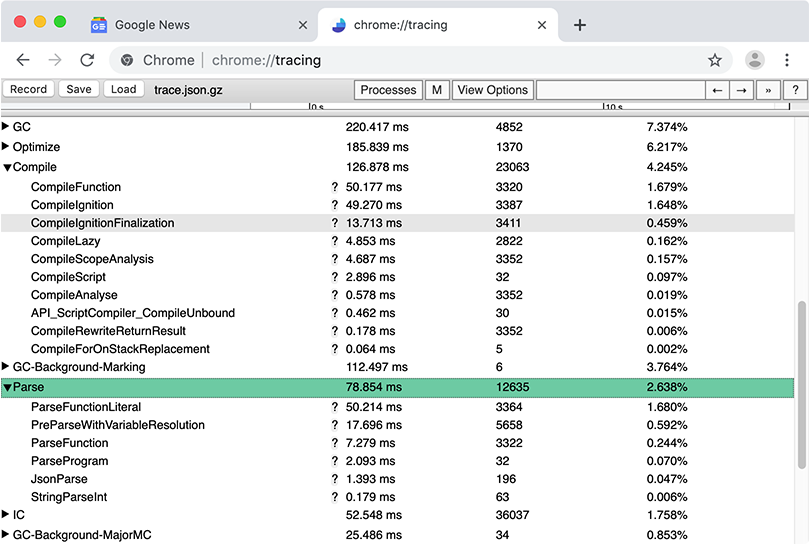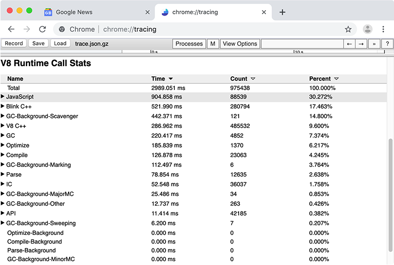The DevTools Performance panel gives insights into your web app’s runtime performance by visualizing various Chrome-internal metrics. However, certain low-level V8 metrics aren’t currently exposed in DevTools. This article guides you through the most robust way of gathering detailed V8-internal metrics, known as Runtime Call Stats or RCS, through chrome://tracing.